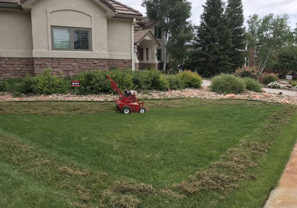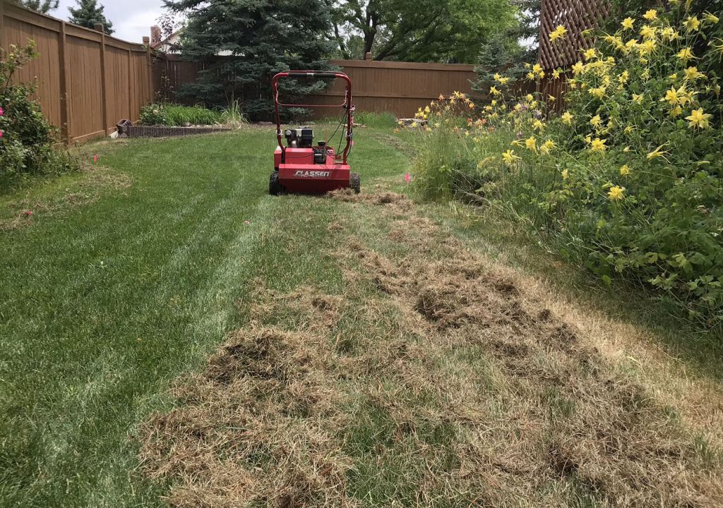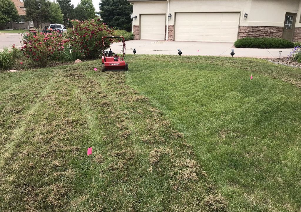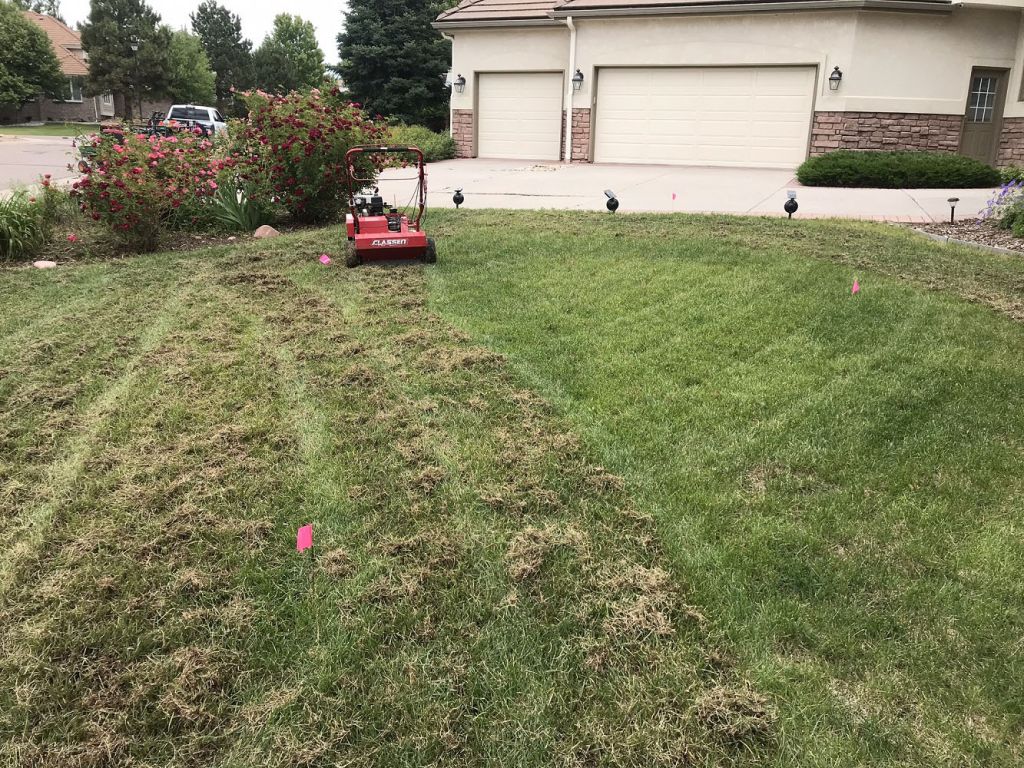Thatch is the layer of decomposing debris that naturally accumulates over time, which can be found on top of the soil below the grass line in your lawn. Some species of turf grass such as Kentucky bluegrass, a favorite here in Colorado, naturally produce more thatch. Contrary to popular belief, leaving grass clippings after mowing does not contribute to the development of thatch. Clippings are mostly water and decompose rapidly, leaving behind beneficial nutrients for the lawn. A certain amount of thatch is normal and is not detrimental to maintaining lawn health; some thatch can even help with resiliency in high traffic areas. Once the thatch becomes more prevalent, however, it can cause problems. An excess of thatch in your lawn will cause it to shed water, thus restricting the absorption of water and nutrients into the soil and resulting in an increased susceptibility to fungi, insects and drought. We recommend power raking once you reach about 1/2 to 1 inch of thatch.